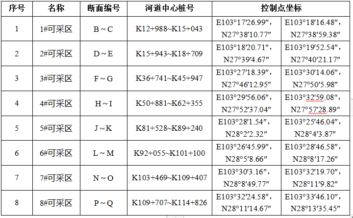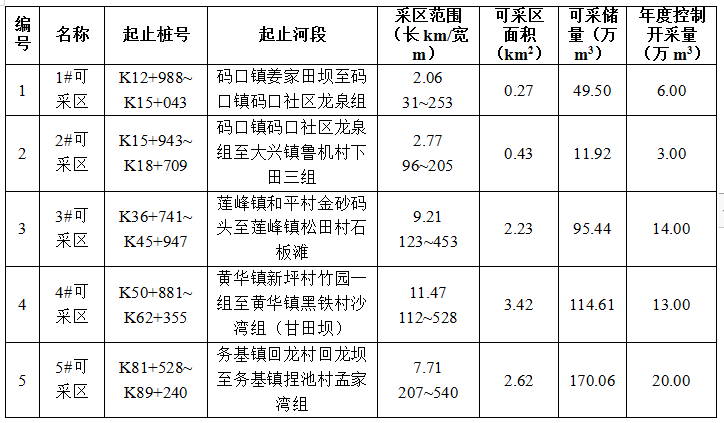 (二)規(guī)劃河段可采區(qū)劃定及基本情況表: