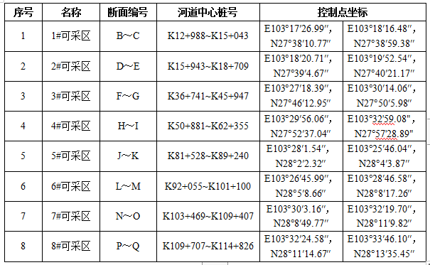 (二)規(guī)劃河段可采區(qū)劃定及基本情況表: